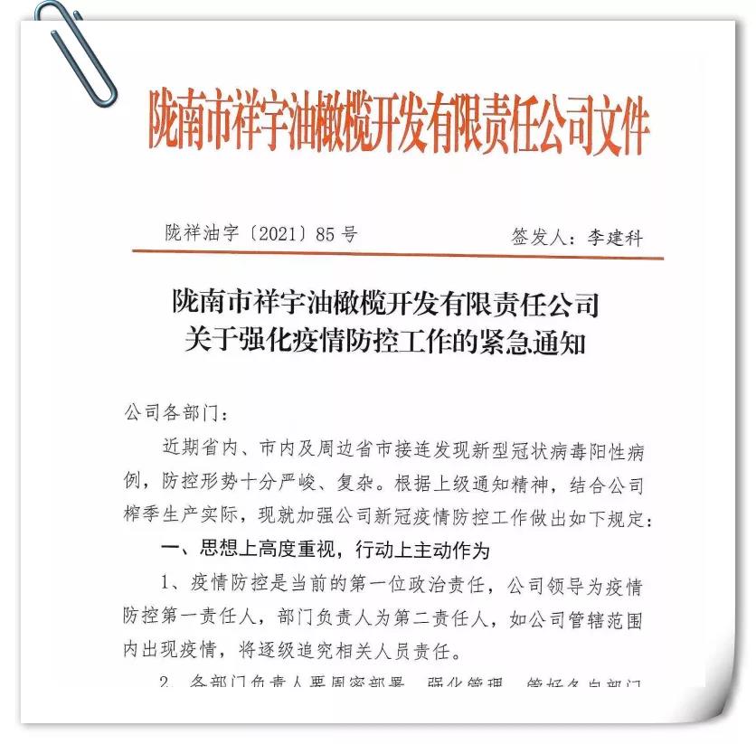 確保今年油橄欖鮮果收購工作圓滿完成,隴南市祥宇油橄欖開發(fā)有限責(zé)任公司根據(jù)實際情況及時成立了疫情防控小組,